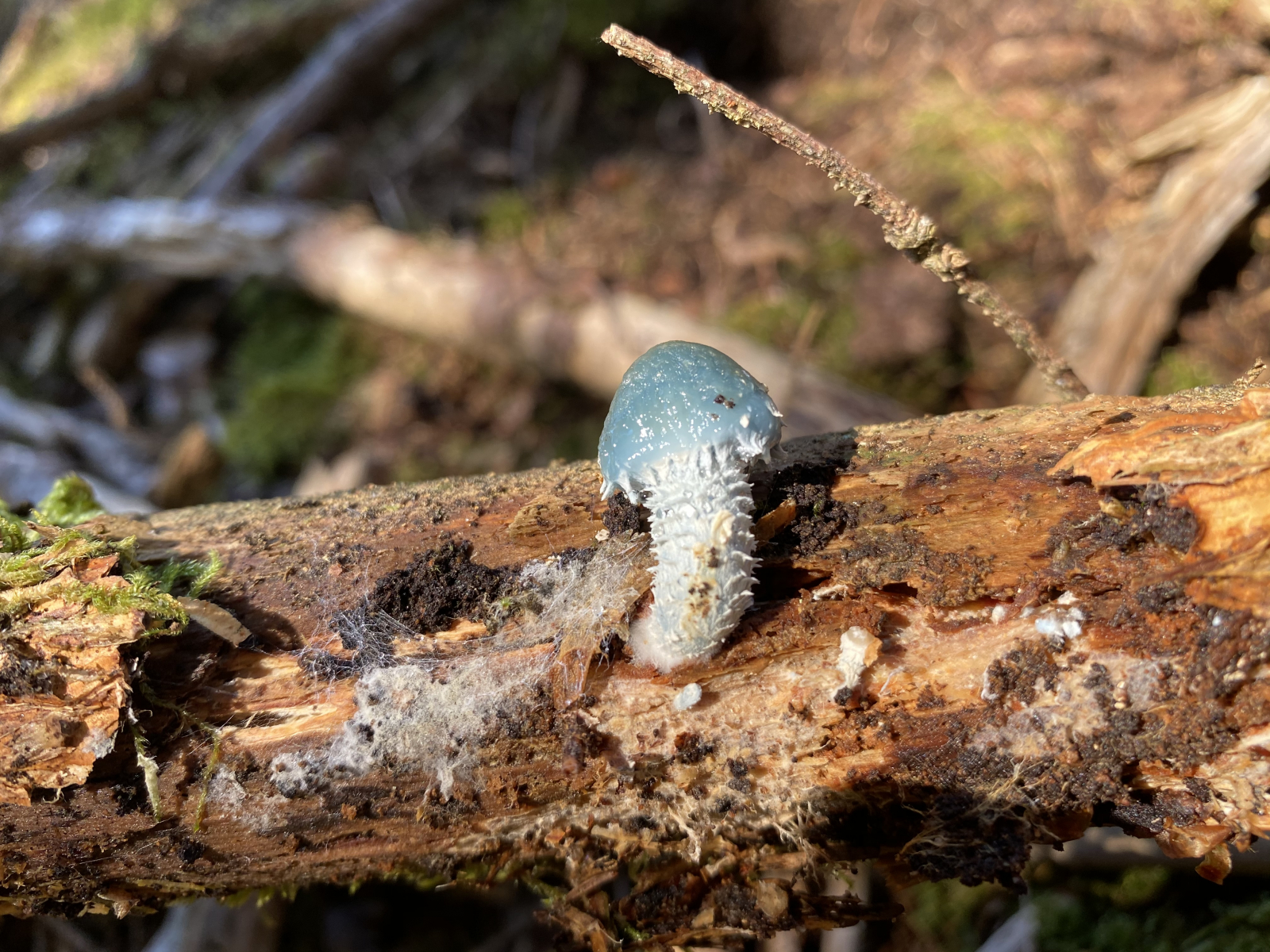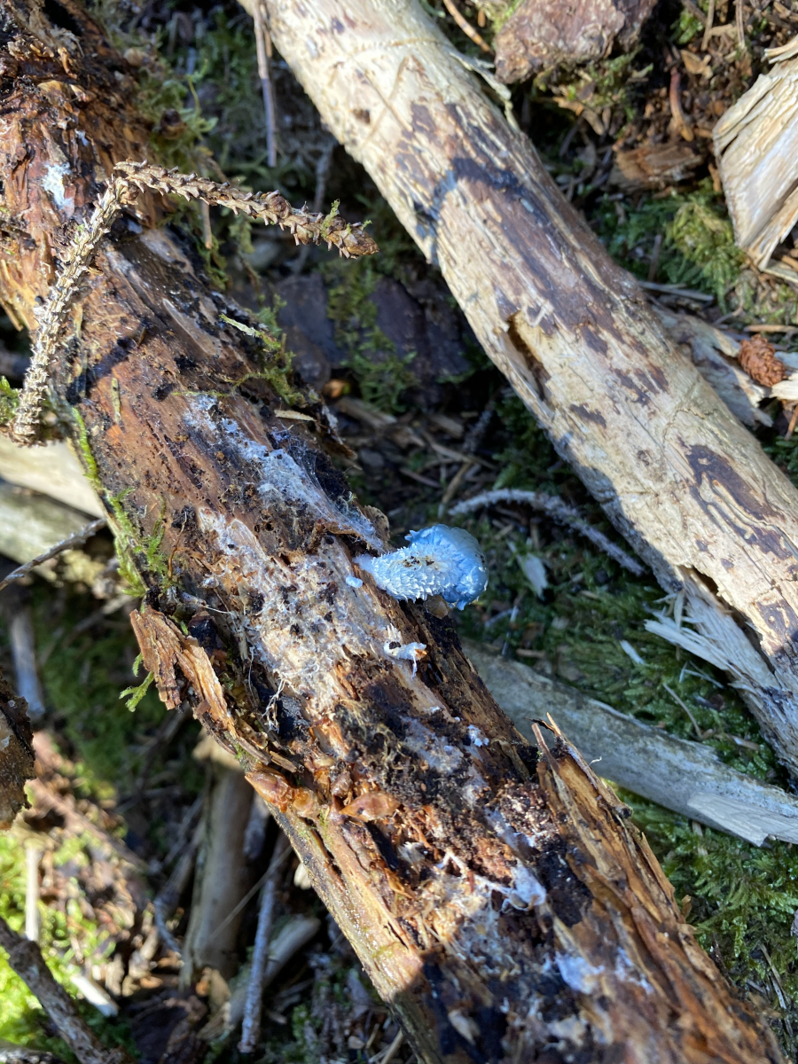 Ich habe am Wochenende in einem Nadelwald (ca. 1600 HM) einen blauen Pilz gefunden. Er ist in etwas 2cm groß und wächst auf Holz. Um welchen Pilz könnte es sich da handeln?