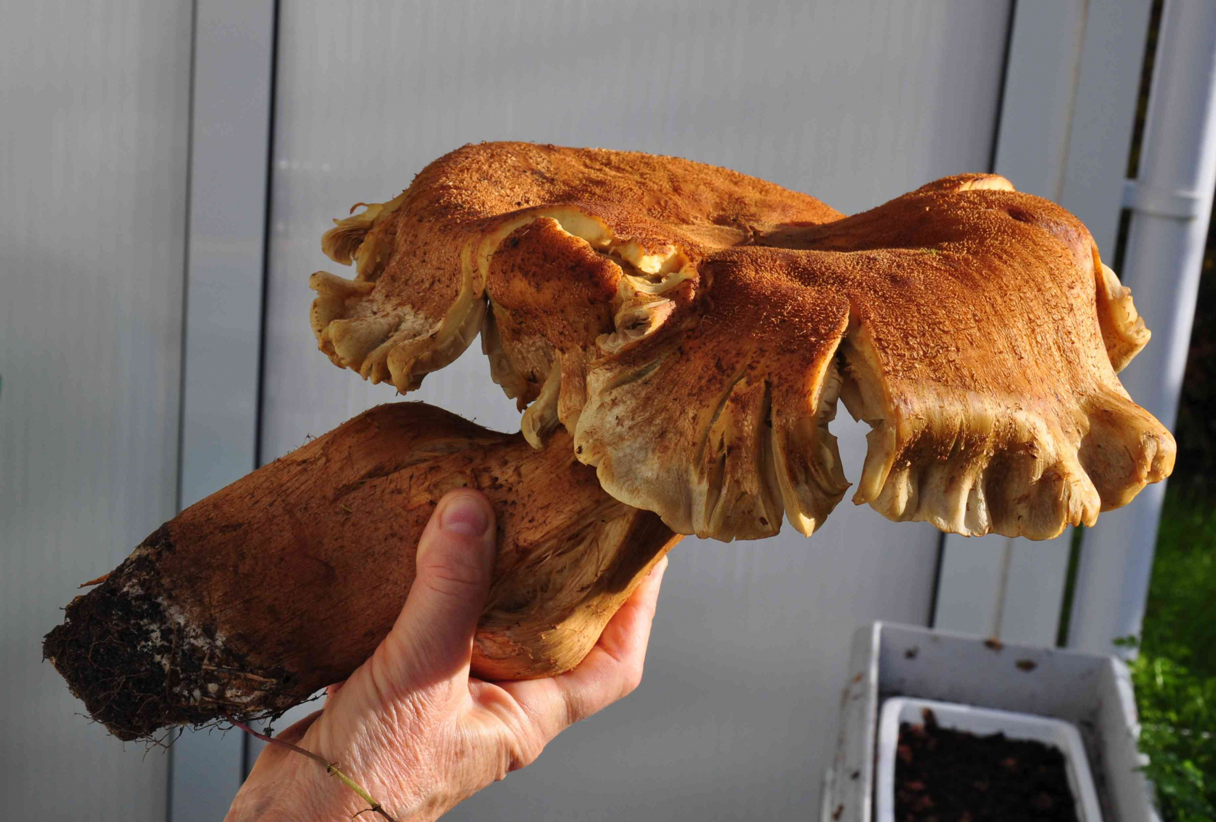 Und ich glaube, das ist auch die Erklärung für dieses Riesenwachstum, dass der Pilz nämlich ganz entgegen der Regel, büschelig zu fruktifizieren, in seltenen Fällen einzeln erscheinen kann!