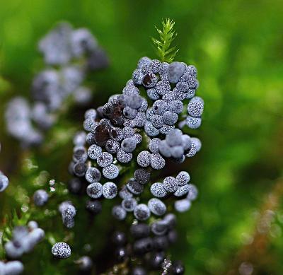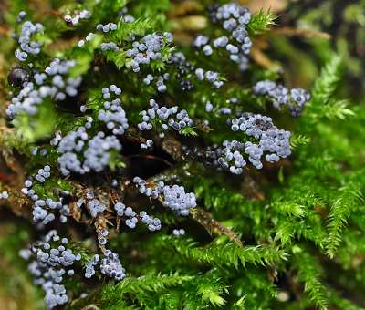 Hallo Ulla, Du weißt doch wieder einen guten Tip! Sie sitzen in großen Mengen wie die Wacholderbeeren auf den Moosstengeln. Farbe blau bis schwarz. Sporen dunkelbraun, oval. Danke Gruß Tosi. -