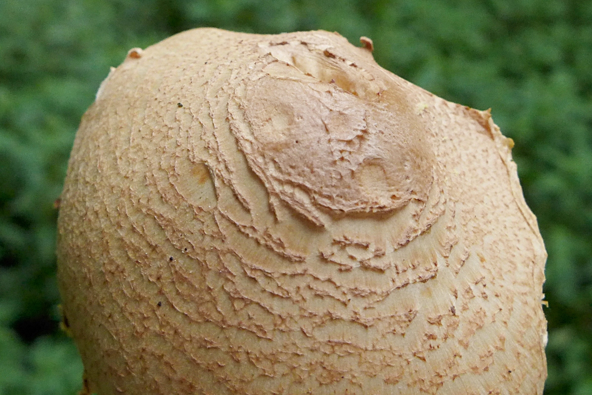 feinschuppig, etwas wollig, nicht einreißend, möglicherweise weiße Cortina (alle Pilze waren vollständig aufgeschirmt.)Stiel ähnlich in der Farbe, weißlich-ockerliche Fasern, von Bereifung nichts gesehen, keine Knolle.