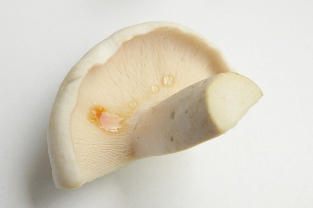 Milch weiß, keine Verfärbung festgestellt (aber Probe nur mit einem quasi eingetrockneten Pilz: den ausgepresst, und noch mal angefeuchtet und noch mal ausgepresst.)