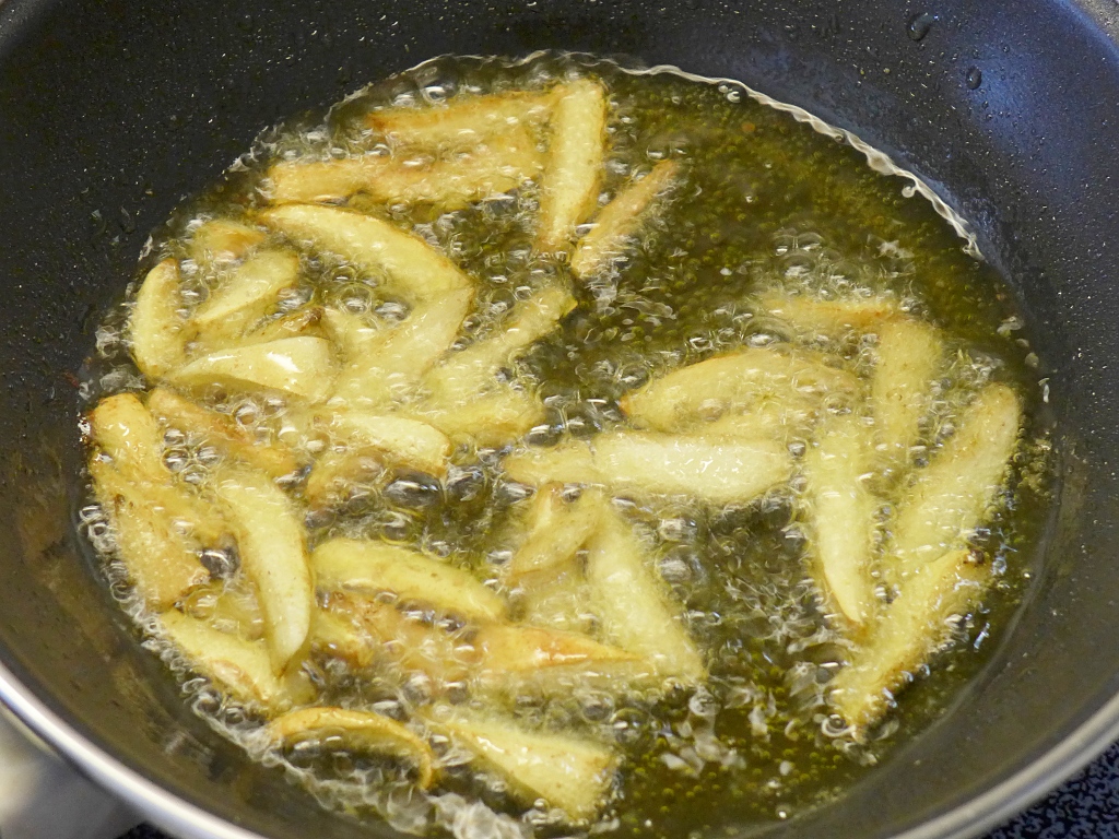 Kurz in heißem Olivenöl schwimmend gebraten, herausgefischt, auf Küchenkrepp abgeölt und leicht gesalzen.