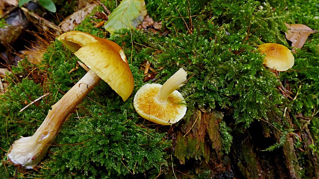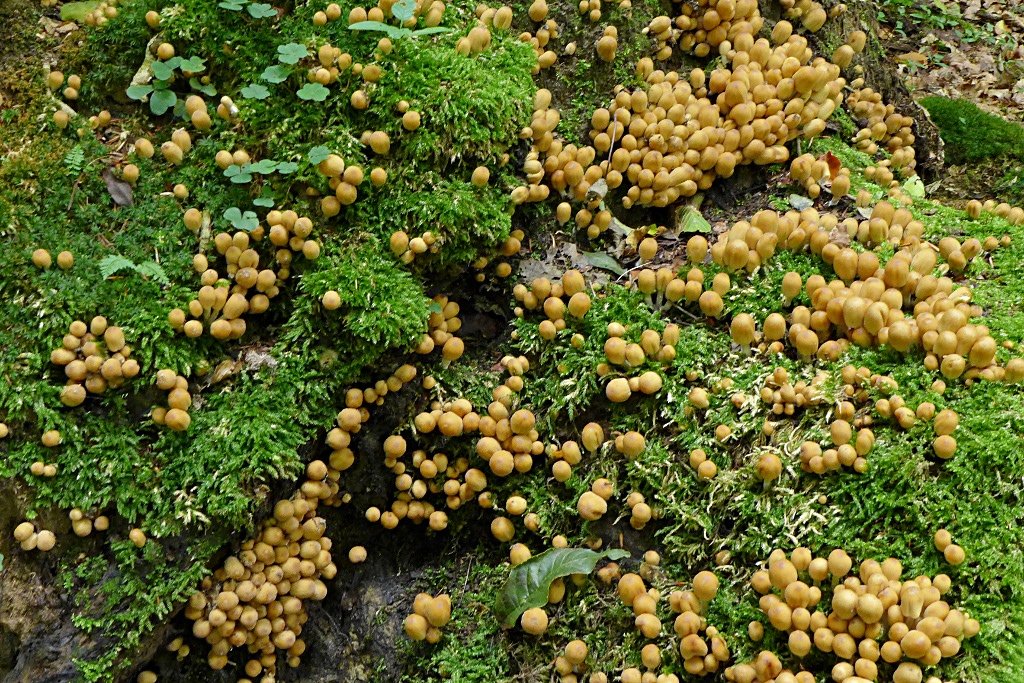 Jedenfalls erschienen die mir nicht mehr so auffällig wie meine alleresten Funde der Art. Ansonsten finde ich schon regelmäßig die hellen H. stark büschelig an Laubholz und dann etwas später die dunklen H. an Nadelholzstubben. -