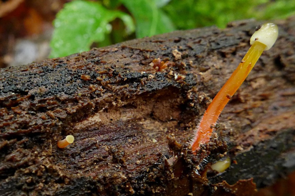 Dabei ist mir dann noch dieser winzige Pilz (wie eine Stecknadel mit leicht vergrößertem Kopf) aufgefallen (im Bild oben), eine leicht eingetrocknete Mycena acicula, Orangeroter Helmling, oder ?24