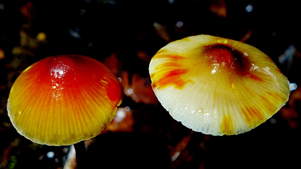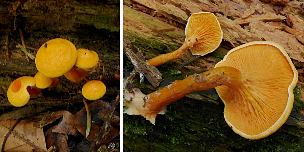 Und noch was ganz Leuchtendes (und klein und im dunklen Winkel, ganz unten zwischen Nadelholzresten): der Falsche Pfifferling, Hygrophoropsis aurantiaca. Anderswo ein Massenpilz, für mich ein Erstfund. Und in dieser Farbvariante (so extrem leuchtend) und so weich, wie er war, würde ich ihn (wahrscheinlich) nicht mit Pfifferlingen verwechseln (die hier auch irgendwie nicht vorkommen).42