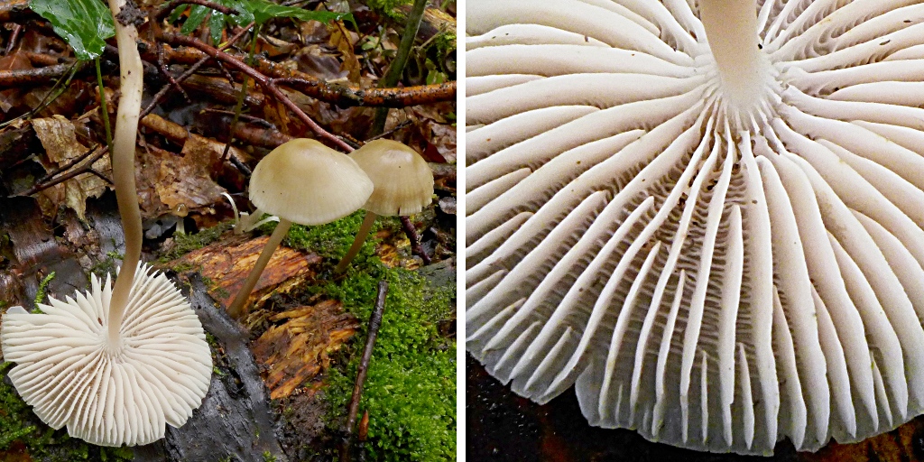 Erst war ich ja bei M. galericulata, habe die Pilze noch mal aufgesucht nach ein paar Tagen, nicht gewachsen, kein Geruch, nicht rosa - aber die Lamellen (im Kleinformat) sind schon vergleichbar, der Stiel und der Hut war etwas anders als die großen Exemplare.