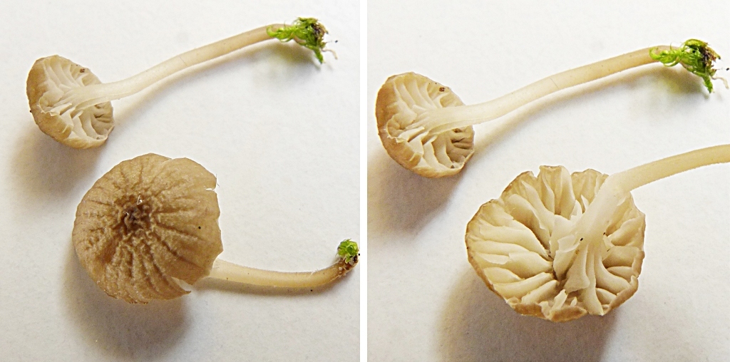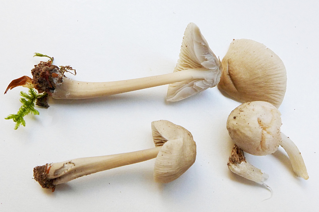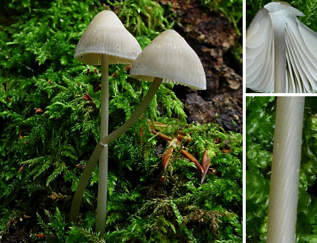 Aber der Pilzhut wird nicht größer als 2-3 cm, der Stiel bleibt so kurz, der Hut ist immer so konisch gebuckelt + geschweift, ganz am Rande auch leicht gerieft und im Ganzen undurchsichtig. Die Lamellen sind ganz schmal angeheftet, bleibend weiß und auch ein bisschen queraderig. Den Stiel finde ich ungewöhlich dick, stabil und kompakt (hohl), einen besonderen Geruch habe ich nicht wahrnehmen können (Pilz zerrieben). Ist das ein Buchen-Wasserfuß, Hydropus subalpinus?