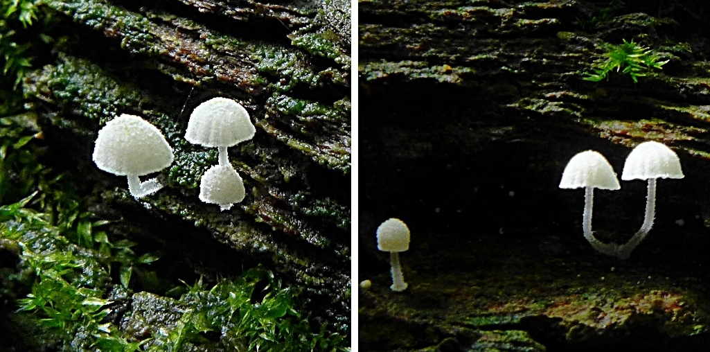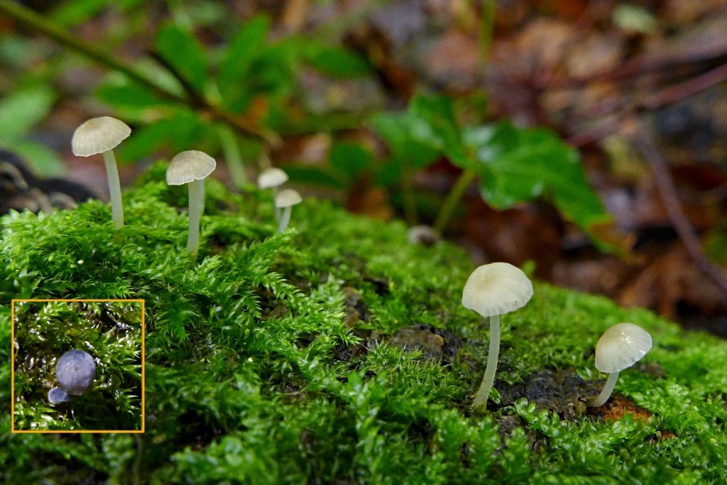 Noch zwei Winzigkeiten (Hut ca. 5-7 mm): die hellen Helmlinge müssten Mycena speirea (cf.), Bogenblättriger Helmling heißen und das blaue Knöpfchen (am gleichen bemoosten Laubholzstamm) habe ich in das Bild hineinkopiert, sollte Mycena pseudocorticola (cf.), der Blaue Rindenhelmling sein. (pers. Erstfunde)15-16