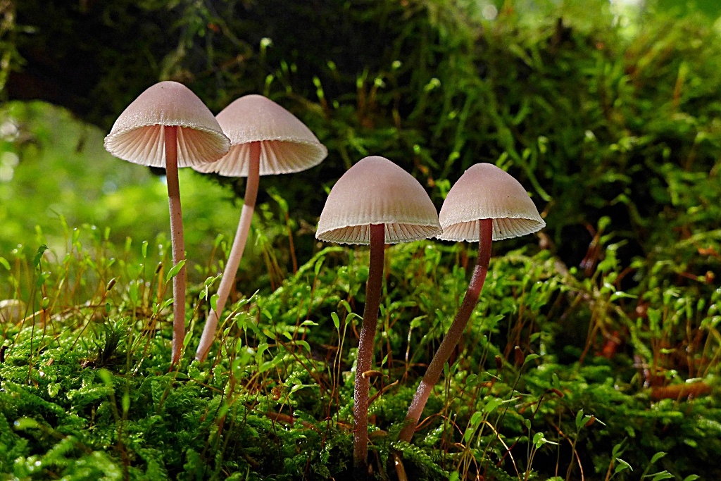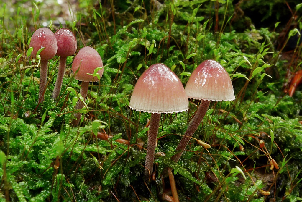 Meinen neuen Lieblingshelmlinge: mit Spitzenröckchen und deutlich bereiftem Stiel, ebenso auf bemoostem Laubholz, nur 2-3 cm groß, relativ ausdauernd (es sind die selben Pilze, 1 Woche später), der Große Bluthelmling, Mycena haematopus (pers. Erstfund)17