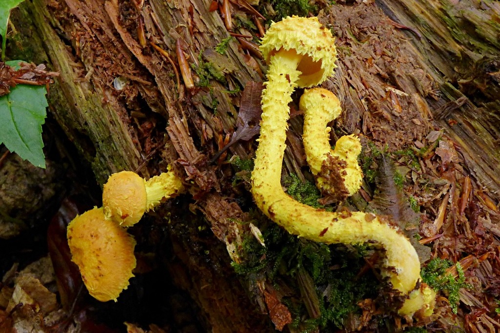 Ein Farbenfeuerwerk (aber klein) und schuppig und trocken (nirgendwo schmierig) an Nadelholz: Pholiota flammans, Feuerschüppling, Geruch und Geschmack fand ich relativ unauffällig, habe gar nichts notiert. ---> noch mal gefunden, selbe Stelle, jetzt würde ich den Geschmack (auch nach Nachlesen von Pholiota-Geschmäckern ... als "rübenartig" bezeichnen, aber nicht als bitter)21