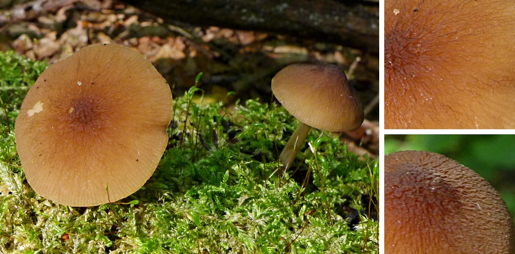 Ein kleines Dachpilzie muss auch hier herein. Alle Pilzchen wuchsen auf bemoostem Laubholz und waren nur 2-3 cm im Durchmesser, ohne Geruch, deutlich geaderter Hut ohne "Samt". Der Stiel war nicht bereift. Ich tippe hier (wg. der Huthauterscheinung, nicht abziehbar, die Haut "bricht" sofort) auf Pluteus cf. phlebophorus, Weißer Adern-Dachpilz, bzw. Geaderter Zwerg-Dachpilz), alternativ eine Art mit Huthaut mit gemischten Zellen, eventuell Pluteus thomsonii (Bereiftstieliger Dachpilz, Graustieliger Adern-Dachpilz), aber der sollte einen bereiften Stiel haben. (pers. Erstfund)