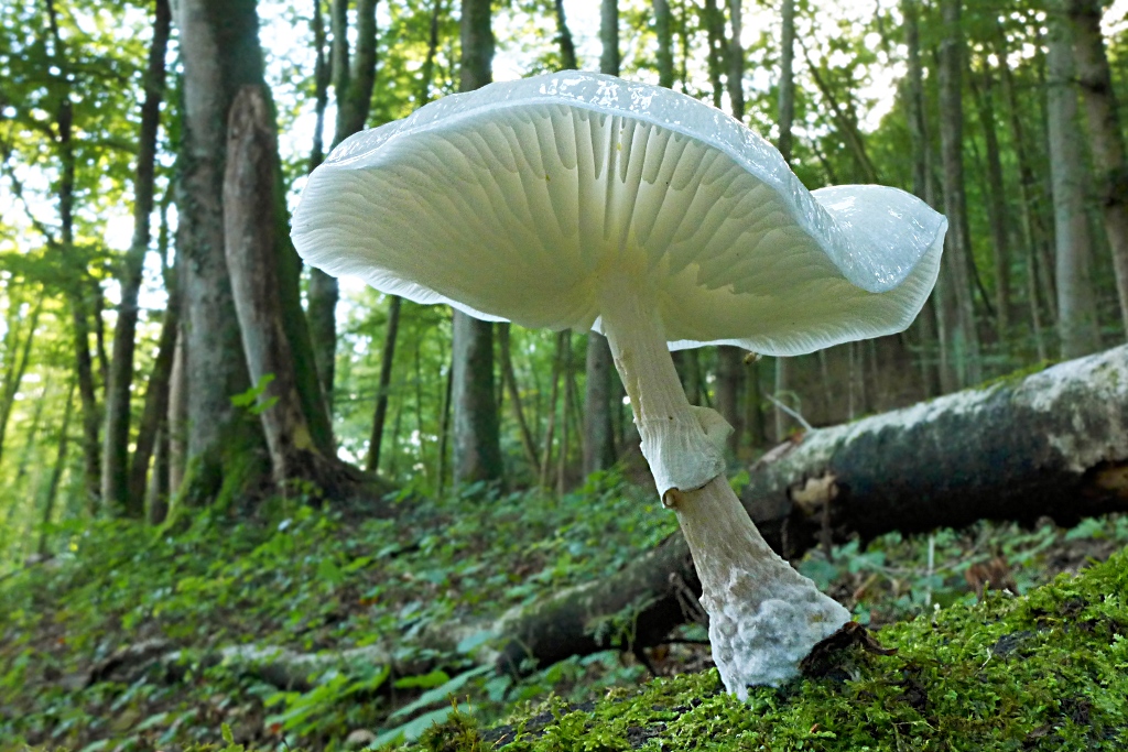 Ebenso sehr häufig, nach Regen, im noch feuchten Kalkbuchenwald, der Gelbmilchenden Helmling, Mycena crocata.