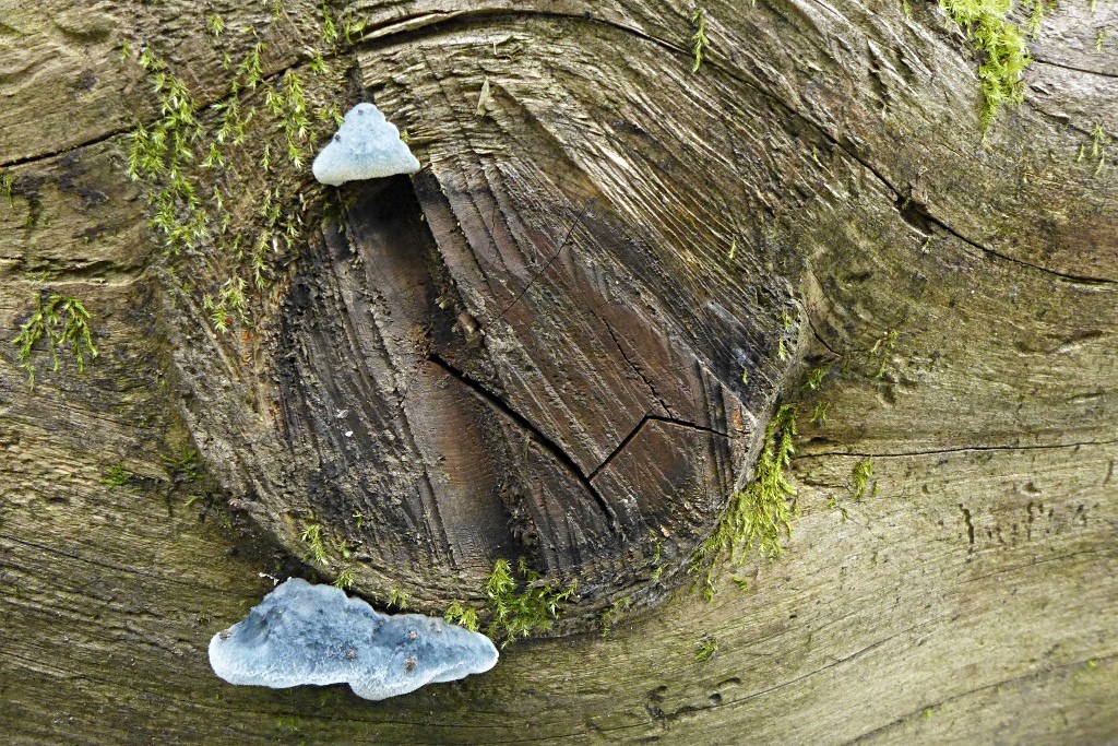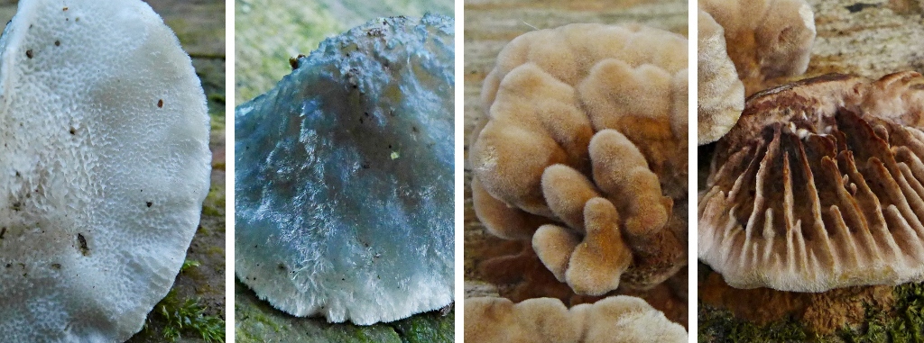 Auch immer wieder schön, so was Blaues am Nadelholz (liegender entrindeter Stamm, ev. Fichte oder Kiefer): Postia caesia, der Blauende Saftporling - und am gleichen Holz Gloeophyllum abietinum, der Tannen-Blättling. Meine früheren Funde waren nicht so frisch, deshalb habe ich die sehr haarige, samtige Oberfläche des Blättlings so noch nie gesehen (immer nur verkahlt).32-33