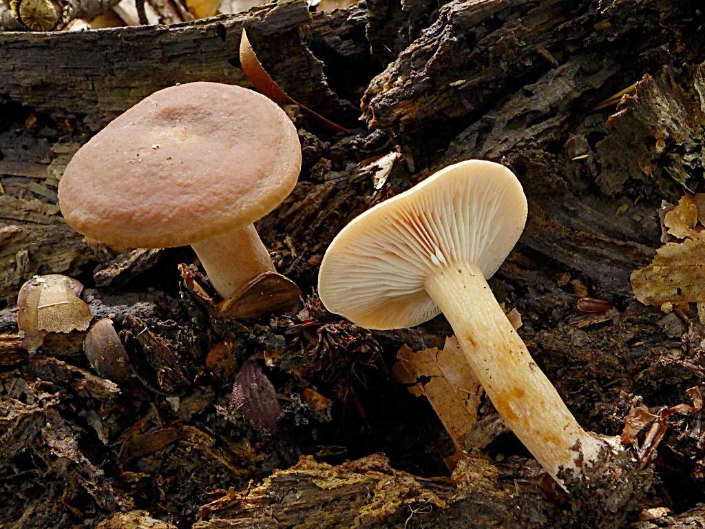 Zweimal Mehlgeruch zum Vergleichen: Einer von 3 winzigen Mehlräslingen zum Riechen "gepflückt", Clitopilus prunulus (frisches Mehl/ Gurke) und schon die ersten Gifthäublinge auf morschem Laubholz, ziemlich einzeln und klein, Galerina marginata (altes Mehl/ ranzig)40
