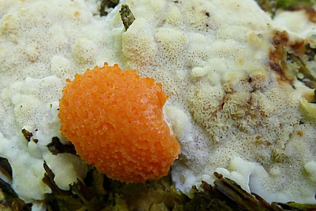 Noch mehr "Orange" hier auf Weiß, Fischeier-Schleimpilz, Tubifera ferruginea auf/ an ... ja ... mmh (die Poren erscheinen auf dem Bild viel größer als in Realität, sind sind kaum sichtbar mit bloßem Auge, keine Rötung) ... auf Physisporinus cf. vitreus ?--> Physisporinus spec (Farbumschlag nicht abgewartet)44