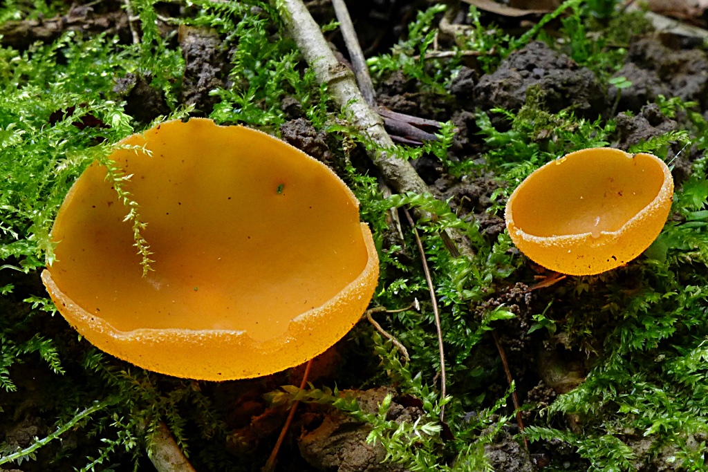 Noch mehr "Orange" hier auf Grün, d.h. direkt auf dem Erdboden, der Orangebecherling, Aleuria aurantia.45