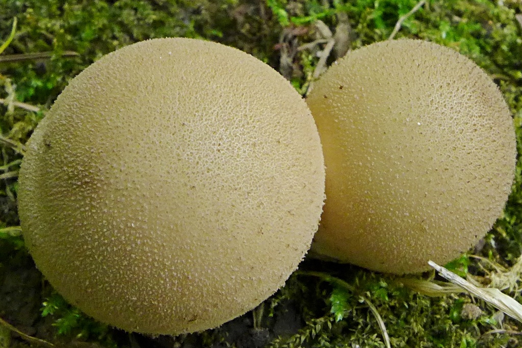 Ein unscheinbarer pers. Erstfund (nur 1-2 cm groß), kleine braune ungestielte Stäublinge auf nacktem Waldboden, mit kleinsten Stachelchen (die kein Netzmuster hinterlassen): Lycoperdon umbrinum, der Bräunliche Stäubling46-47