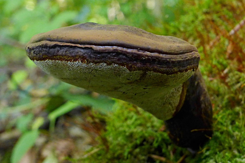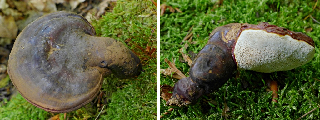 Ein pers. Erstfund (in D.), über den ich mich gefreut habe, ein Gestielter Lackporling. Vermutlich war der Stubben Nadelholz (ich tippe auf Lärche), es waren mehrere Pilze, einen habe ich mitgenommen. Die Oberfläche/ der Zuwachs und vor allem der Stiel war sehr dunkel (ein alter Pilz war fast völlig schwarz). Ich tippe auf den Dunklen Lackporling, Ganoderma carnosum (alternativ: Ganoderma lucidum, Glänzender Lackporling)