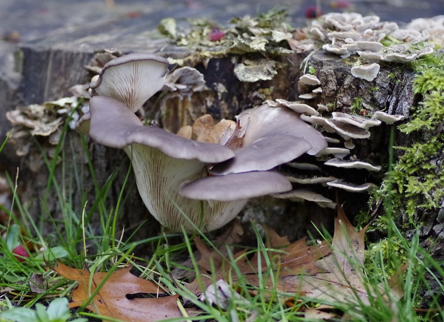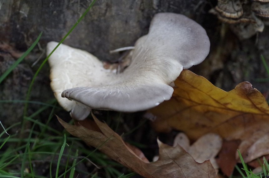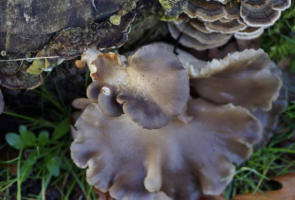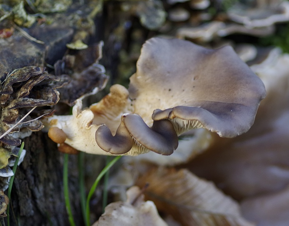 Der kleinere Fruchtkörper über den großen ist bemerkenswert, er hat mehrere Auswüchse bekommen, welche wie eigenständige Fruchtkörper wirken. War dieser Fruchtkörper zuerst so blass, so sind seine neuen Wuchsansätze ansehnlich und haben wieder eine schöne "Austernfarbe".
