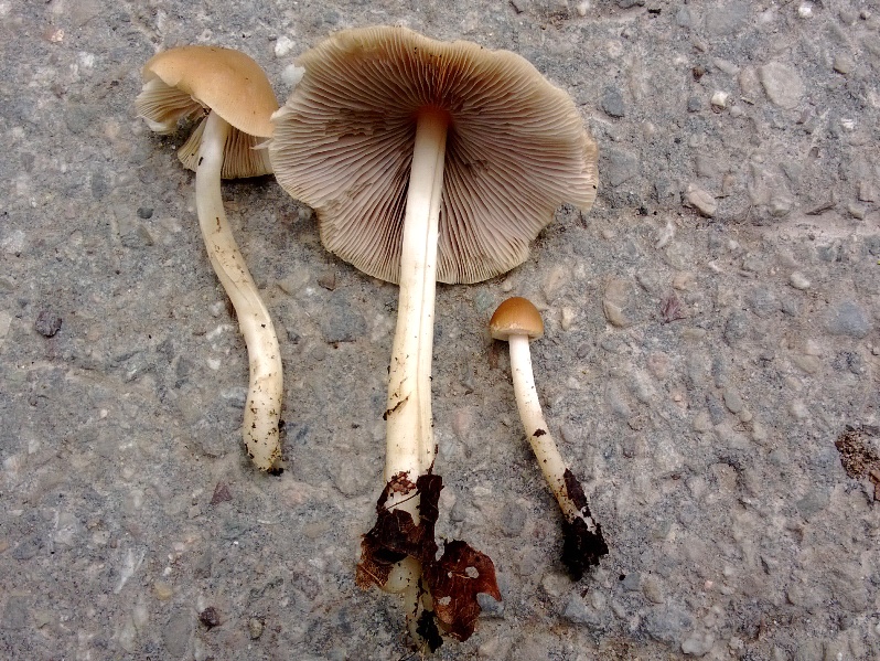 ... und bald darauf schon die ersten Pilze. Neben dem Schuppigen Porling (Polyporus squamosus) und dem Getigerten Sägeblättling (Lentinus tigrinus) hier vermutlich der Behangene Faserling (Psathyrella candolleana) .