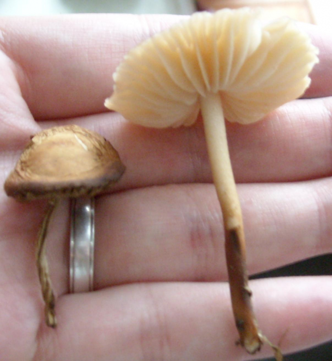 Hutdurchmesser 2cm, Höhe (Stielende bis Hutoberkante) 3cm, riecht frisch-würzig (schwer zu beschreiben)Der andere ist aus dem Garten, der wächst da auch in Grüppchen.