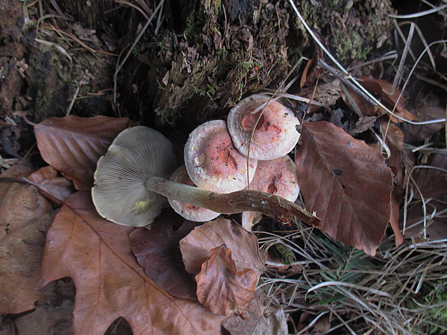 Bei ein paar Fichten waren diese, süßlich riechenden Trichterlinge zu sehen. Ich habe sie als Bleiweiße Trichterlinge (Clitocybe phyllophila) eingestuft ohne es beweisen zu können.