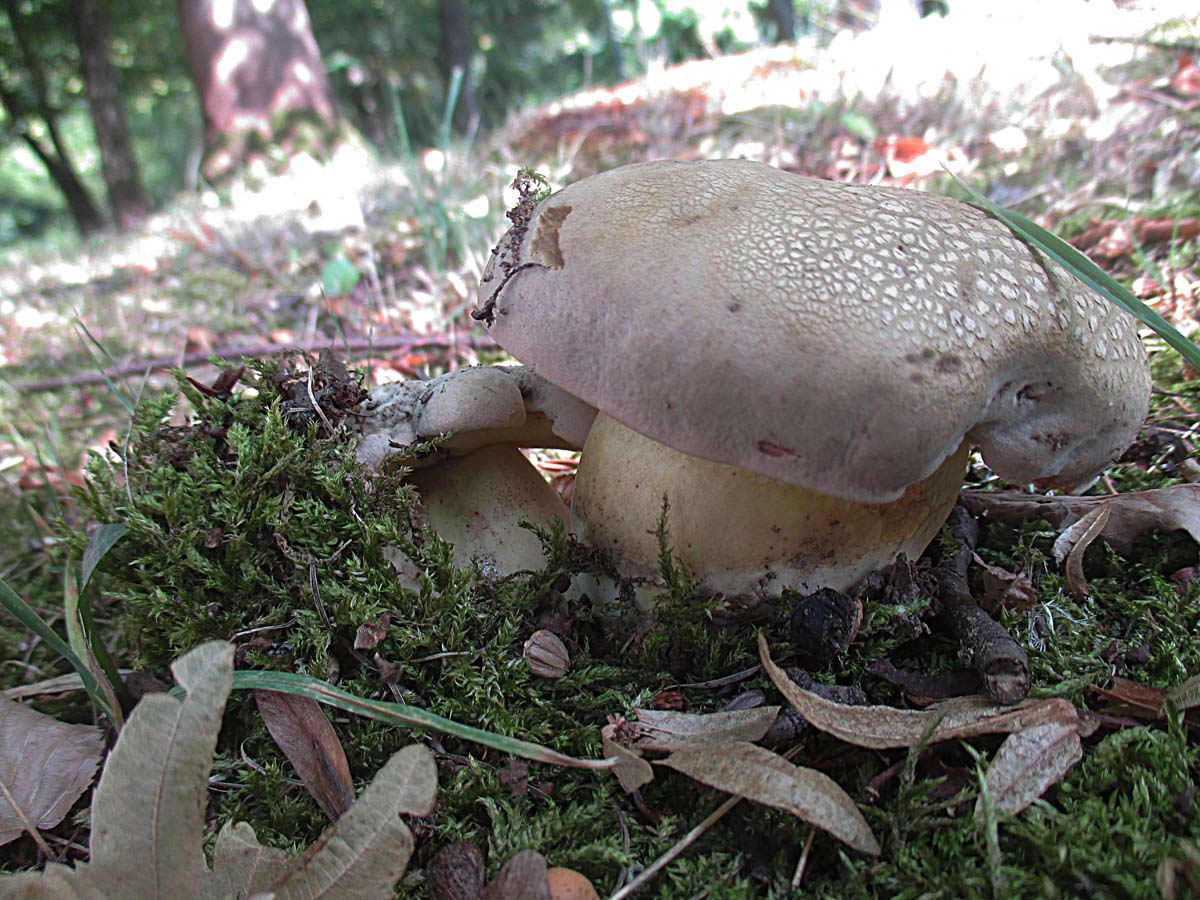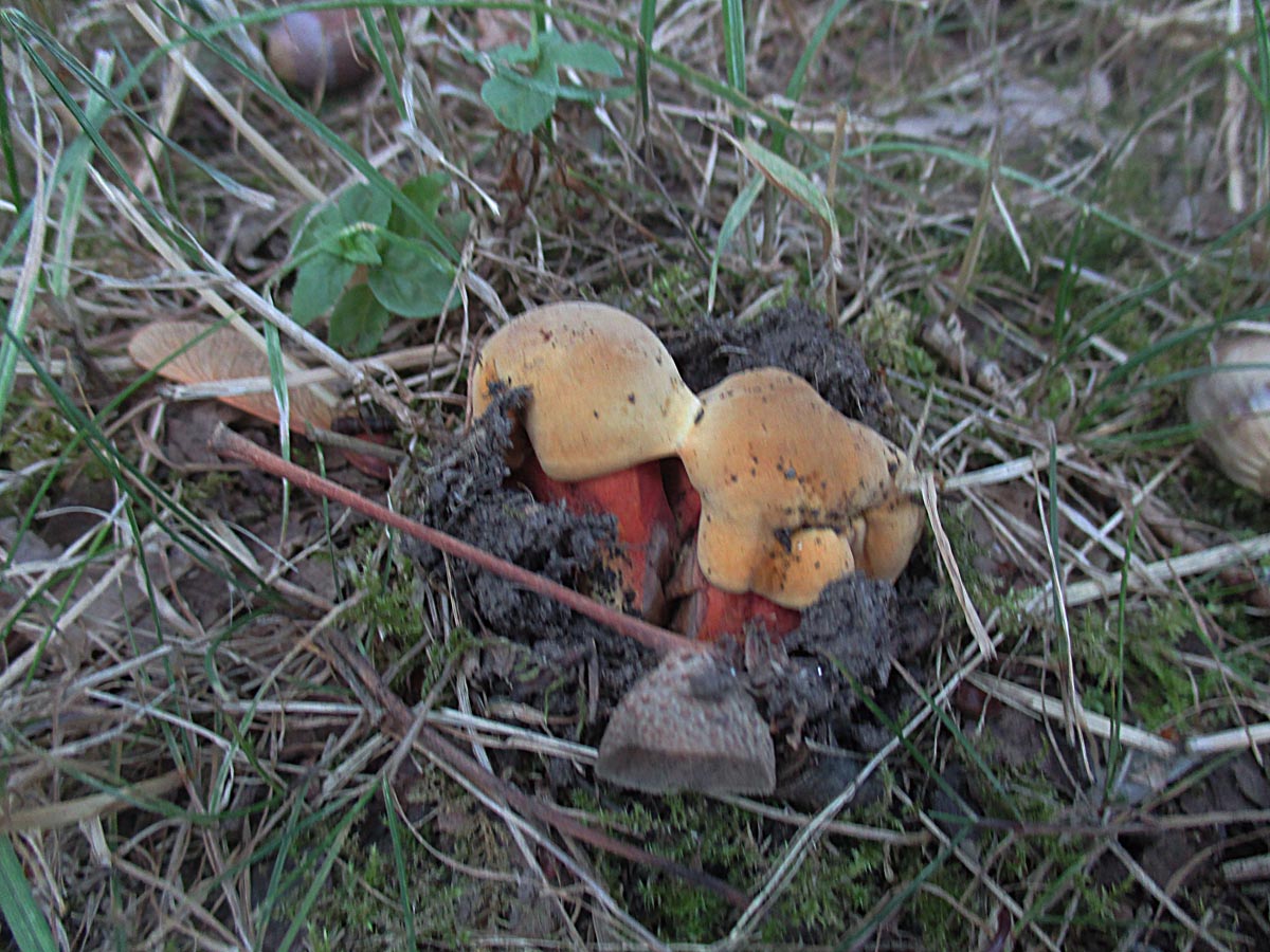 Boletus radicans an einem recht schattigen Ort. Die scheinen wie die Flockis auch mit sehr wenig Feuchtigkeit auszukommen.