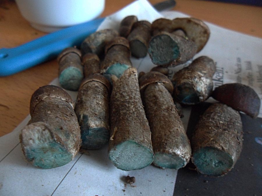 ich habe heute einige Miniatur-Raufüße gefunden die ich nicht zuordnen kann. Das Fleisch bleibt weiß aber die Basis verfärbt sich nach 10 Minuten blau. Für Leccinum variicolor paßt die Gesamtverfärbung und für Leccinum cyaneobasileucum die Stielschuppenfarbe nicht.