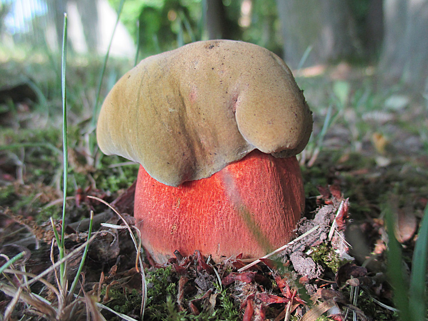 ich habe doch gewußt daß die Regenmassen, welche in den letzten 14 Tagen bei mir heruntergekommen sind (0,6 l/m²), einen Schub verursacht haben. Neben halbvertrockneten Perlpilzen, Grauen Wulstlingen und Frauentäublingen haben sich tatsächlich drei Röhrlinge hervorgetraut. Es handelt sich dabei um zwei Fahle Röhrlinge
