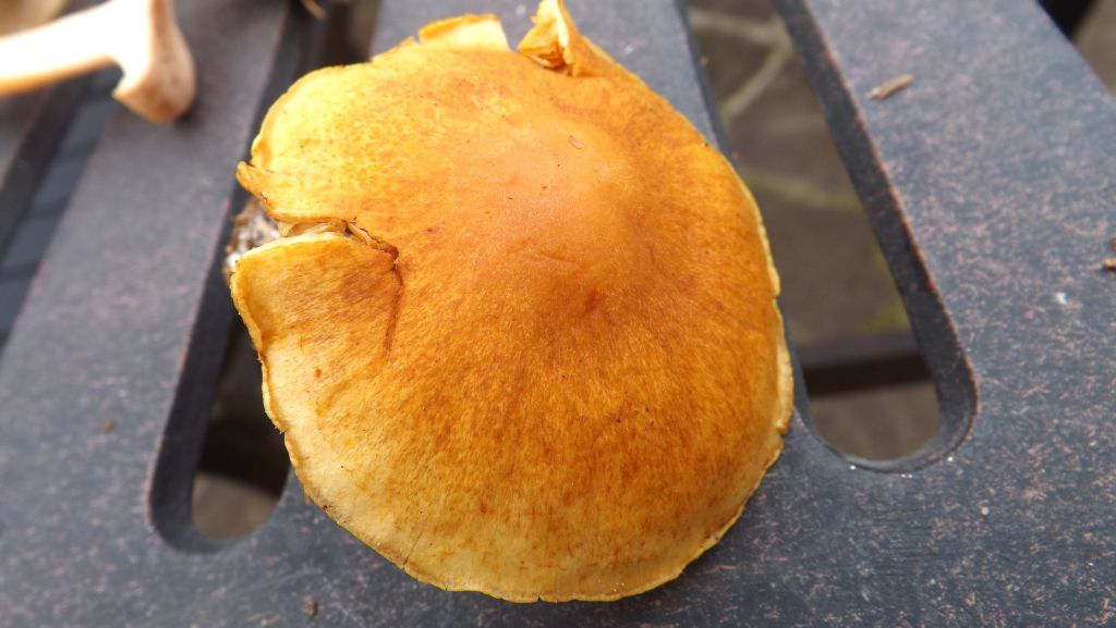 Der recht stark gefaserte Stiel könnte auf einen Ziegelroten Schwefelkopf (Hypholoma sublateritium) hindeuten.