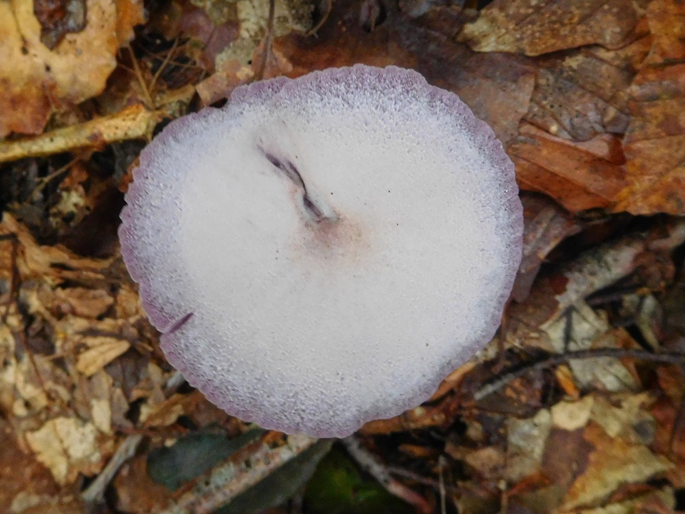 Bis zu 5 cm, jung gewölbt später sehr unterschiedlich gebogen, mit glatter am Rande leicht geriefter Oberfläche, die violette Färbung des Hut kan bei Trockenheit stark verblassen der Pilz kann dann sogar weiß erscheinen.