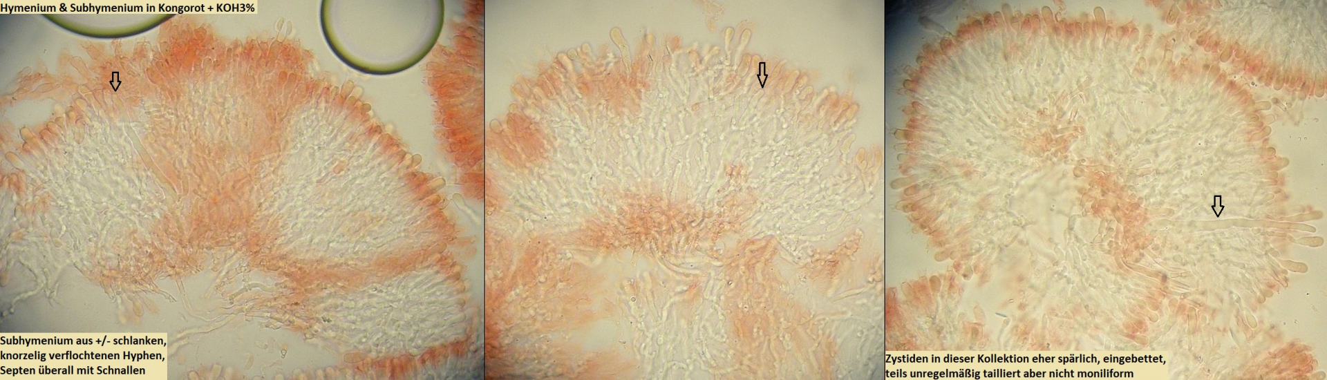 Hyphenstruktur monomitisch, Septen mit Schnallen; Hyphen in Subikulum und Zahntrama kompakt gebündelt / parallel, teils mit verdickten Wänden, gelegentlich mit feinen Kristallanlagerungen; Hyphen im Subhymenium aufsteigend, knorzelig verflochten und verzweigt, aber in recht lockerer Textur; Basidien keulig, oft unregelmäßig eingeschnürt, relativ groß (bis um 40µm), viersporig (einzelne zweisporige Basidien können eingestreut sein); Zystiden meistens eingebettet in Subhymenium / Hymenium, selten die Basidien überragend, dünnwandig, schlauchförmig und meistens unregelmäßig tailliert, gelegentlich auch deutlich moniliform