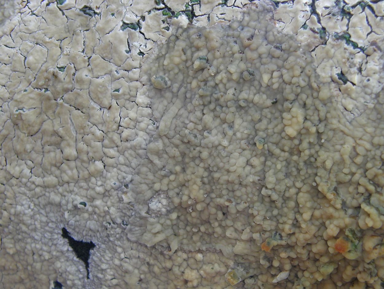 Fruchtkörper anfangs kleinfleckig (dann normalerweise rundlich), bald zusammenfließend und zuletzt großflächig ausgebreitet, vollständig resupinat; einigermaßen variabel in der Form: Von dünn und glatt bis knubbelig, grob warzig, faltig, rippig oder alles kombiniert, stark strukturierte Bereiche auch deutlich über 1mm dick, ansonsten dünner; frisch mit wachsartiger Haptik, trocken eher dünn und spröde hautartig; Ränder polymorph, frisch und bei wachsenden Fruchtkörpern gerne deutlich fransig gewimpert, sonst auch unauffällig flaumig ausdünnend, normalerweise weißlich (wie Subikulum) bzw. heller als Fruchtkörper (wenn nicht Fruchtkörper ebenfalls weißlich); farblich insgesamt ebenfalls variabel; cremeweiß, ockerlich, gelblich, ockerbräunlich, graugelblich; ohne Reaktion auf KOH