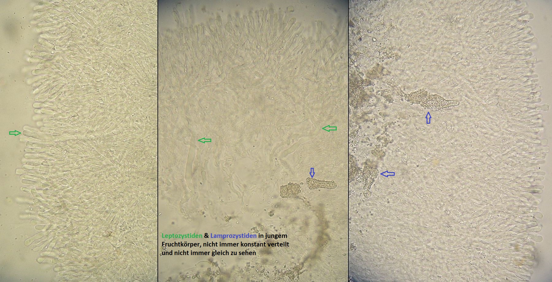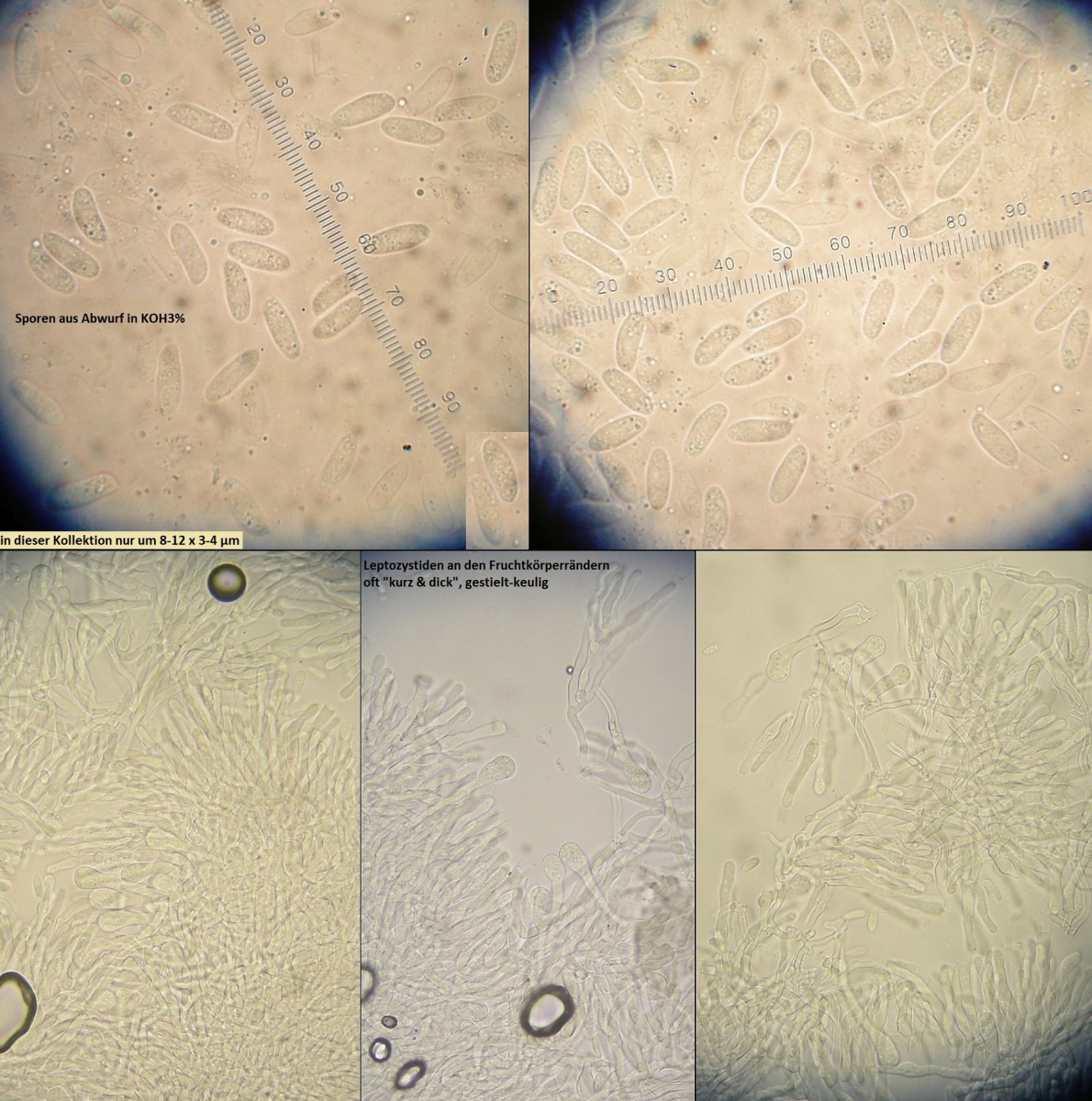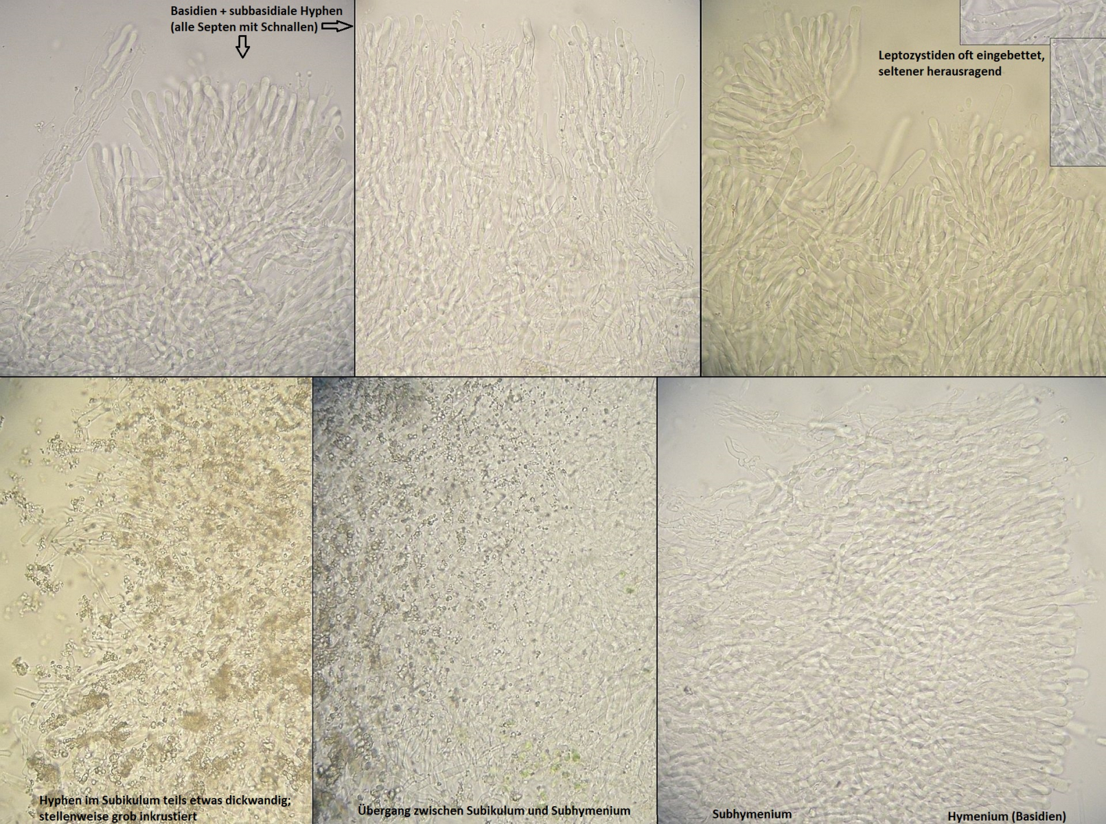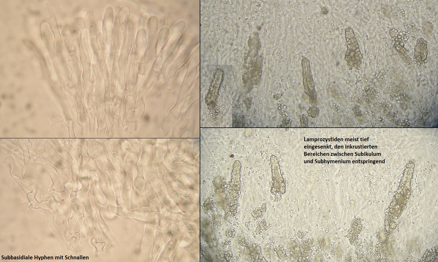 Hyphenstruktur monomitisch; Septen im ganzen Fruchtkörper mit Schnallen; Hyphen hyalin, vorwiegend dünnwandig, im Subhymenium aufsteigend, knorzelig verflochten aber recht locker, im Subikulum parallel zum Substrat in locker verwobenen Strängen, gelegentlich mit massiven Inkrustierungen vor allem im Bereich zwischen Subikulum und Subhymenium, die aber nicht immer und nicht überall ausgeprägt sind; Lamprozystiden spärlich, oft im Übergang Subikulum / Subhymenium entspringend und im Subhymenium eingesenkt, stark inkrustiert und dickwandig; Leptozystiden häufig, recht variabel in der Form und teils mit lichtbrechnendem Inhalt (–žGloeozystiden–œ, normalerweise aber SA-), meistens schlauchförmig, zylindrisch oder schmal keulig (teils etwas eingeschnürt), in frischen Bereichen des Fruchtkörpers aber auch breitkeulig, blasig, utriform und oft gestielt (möglicherweise noch nicht voll entwickelte Form); Basidien unregelmäßig keulig, viersporig, mit Basalschnalle; Sporen schmal ellipsoid bis schlank zylindrisch, teils etwas gekrümmt, in der Größe reht variabel; 9-16 x 2,5-4,5 µm