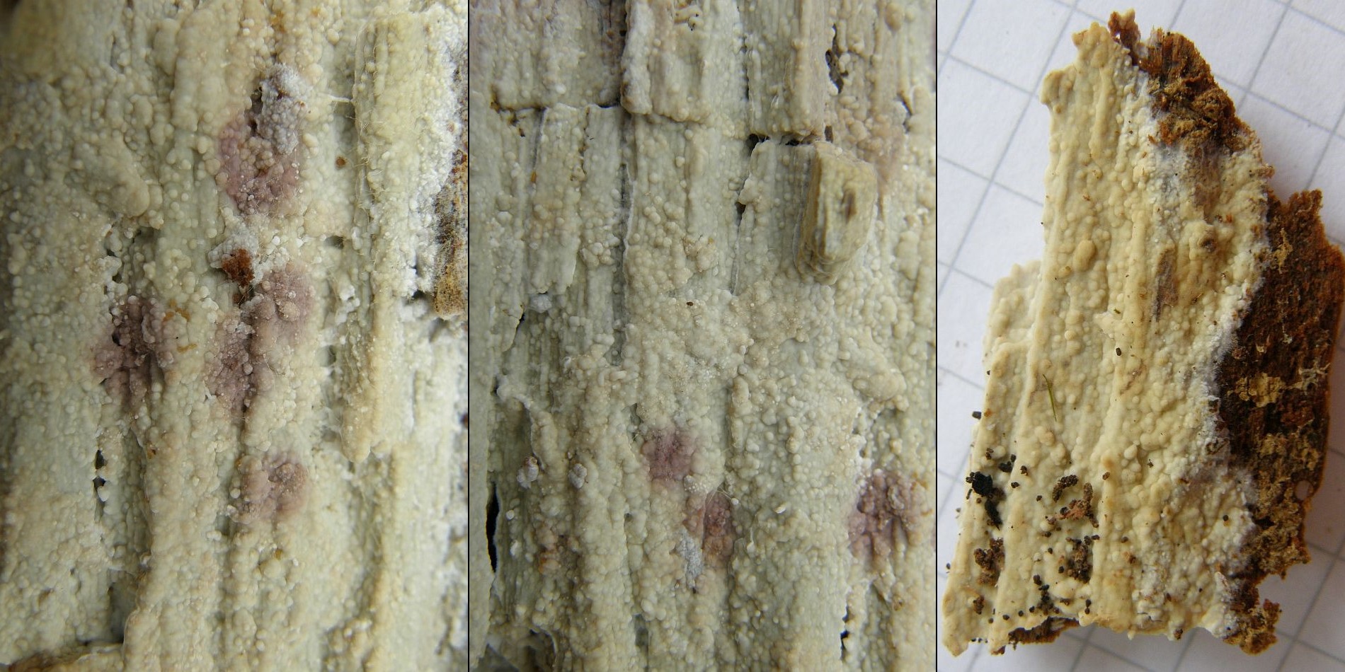 Fruchtkörper resupinat, aus kleineren Flecken zu teils recht großflächigen Belägen zusammenfließend; dünn bis sehr dünn (ca. 0,1 - 0,5 µm) glatt bis warzig; frisch mit leicht wachsartiger Haptik, sonst häutig-filzig, nicht als ganzes ablösbar; cremeweißlich, später auch blass ockerlich, reif mit +/- ausgeprägten, rosa bis rosaockerlichen Flecken, gelegentlich mit größeren, rosa getönten Bereichen; Ränder unauffällig, wenn vorhanden weißlich und fein flaumig