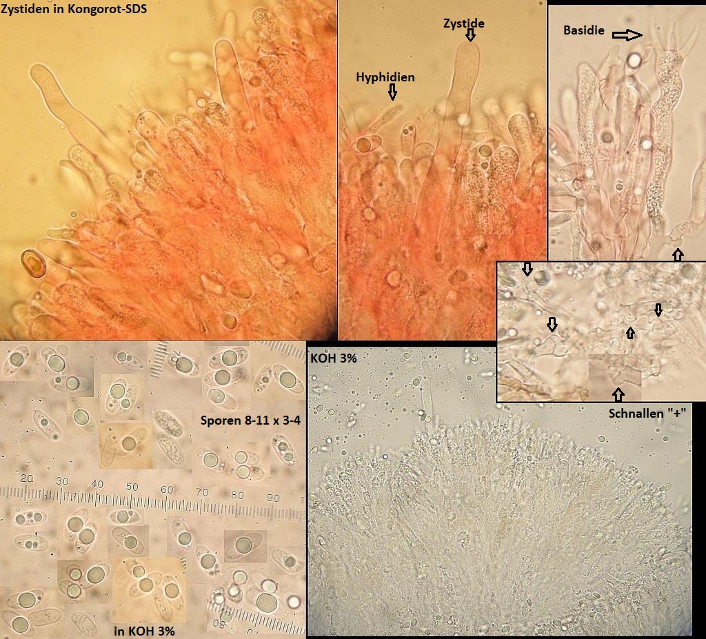 Sporen glatt, dünnwandig, hyalin, ohne Reaktion in Melzer, meist mit Inhalt aus mehreren groben Tropfen, in eigenen Kollektionen vorwiegend um 8,5-12 x 3-4,5 µm; Q normalerweise deutlich >2