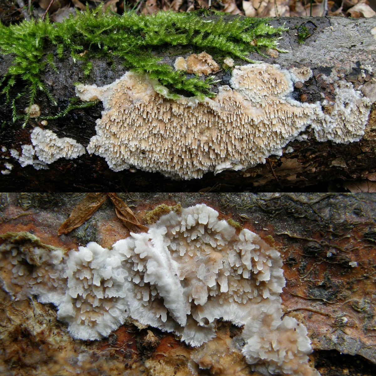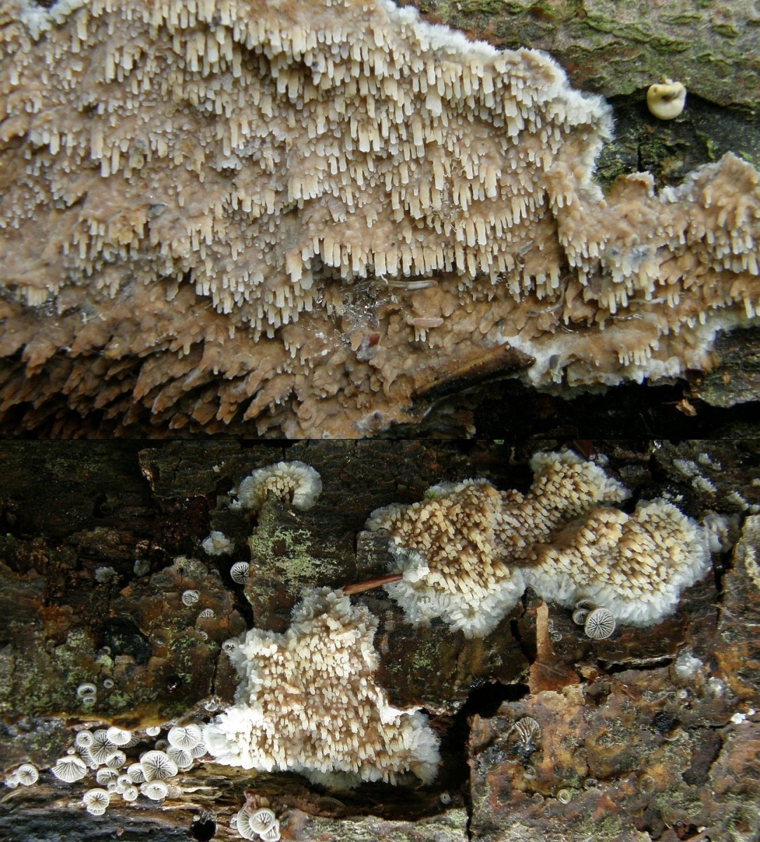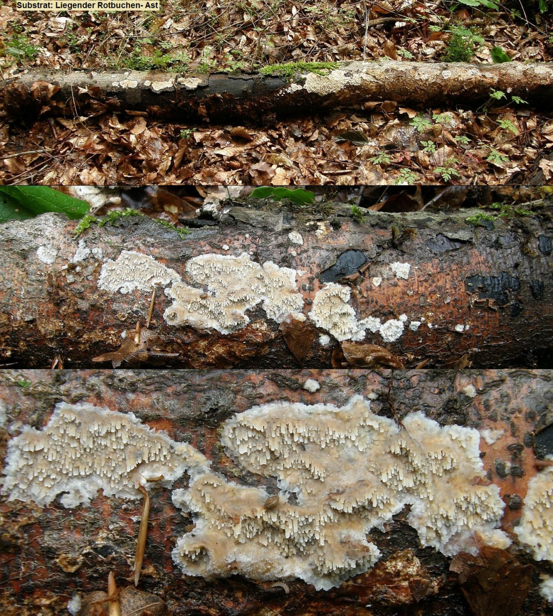 die Pilze beginnen mit der Fruchtkörperbildung meistens an abgestorbenen, aber noch ansitzendem Substrat im Luftraum, wachsen aber auch an abgefallenem Substrat noch weiter, dann sehen die Zähnchen und Stacheln bisweilen merkwürdig verbogen aus, wenn der Pilz sie nach dem Abfallen des Astes wieder versucht, geotrop auszurichten;