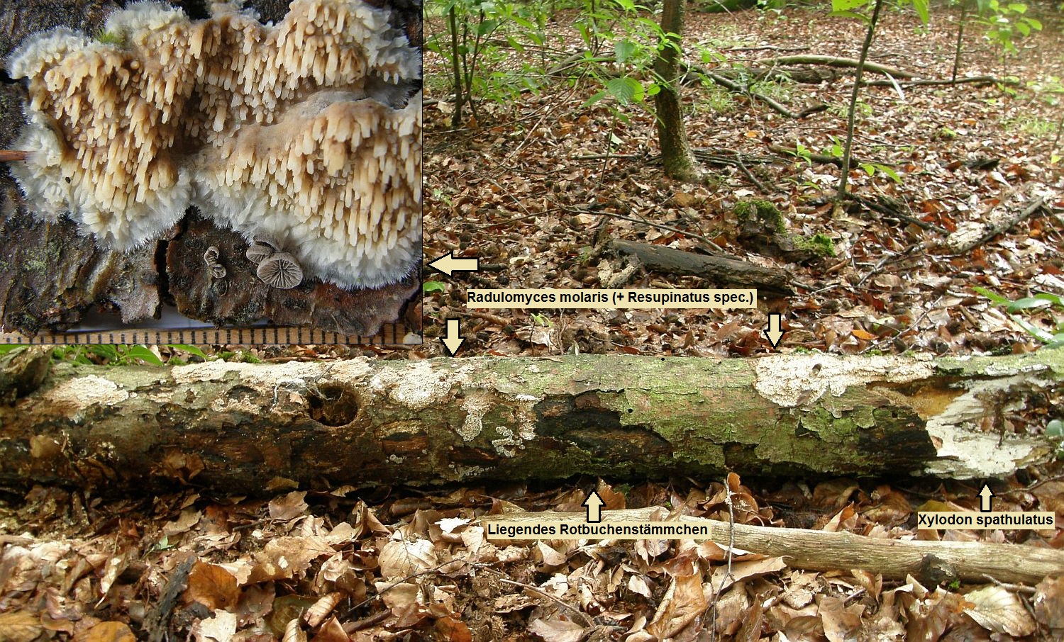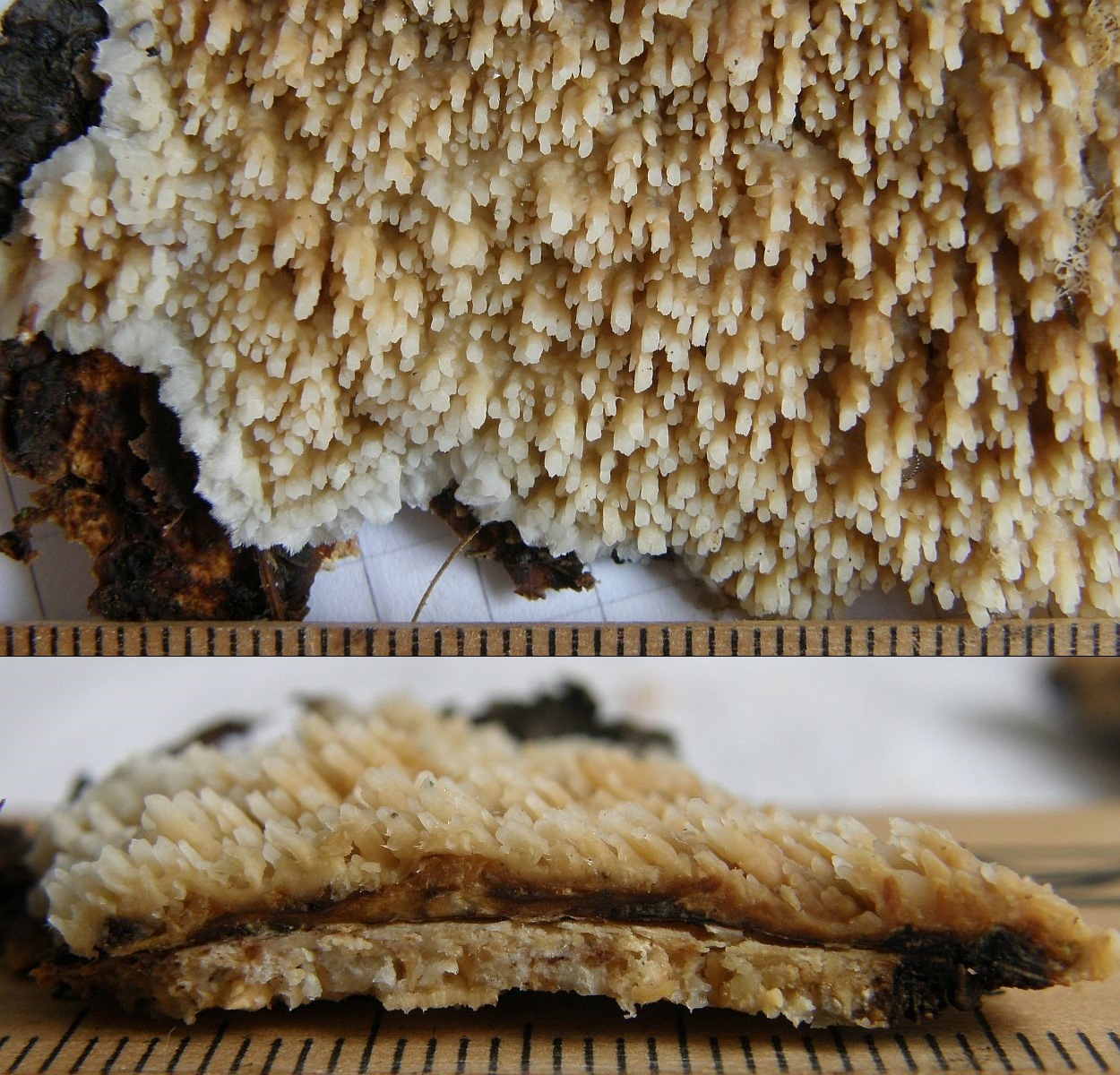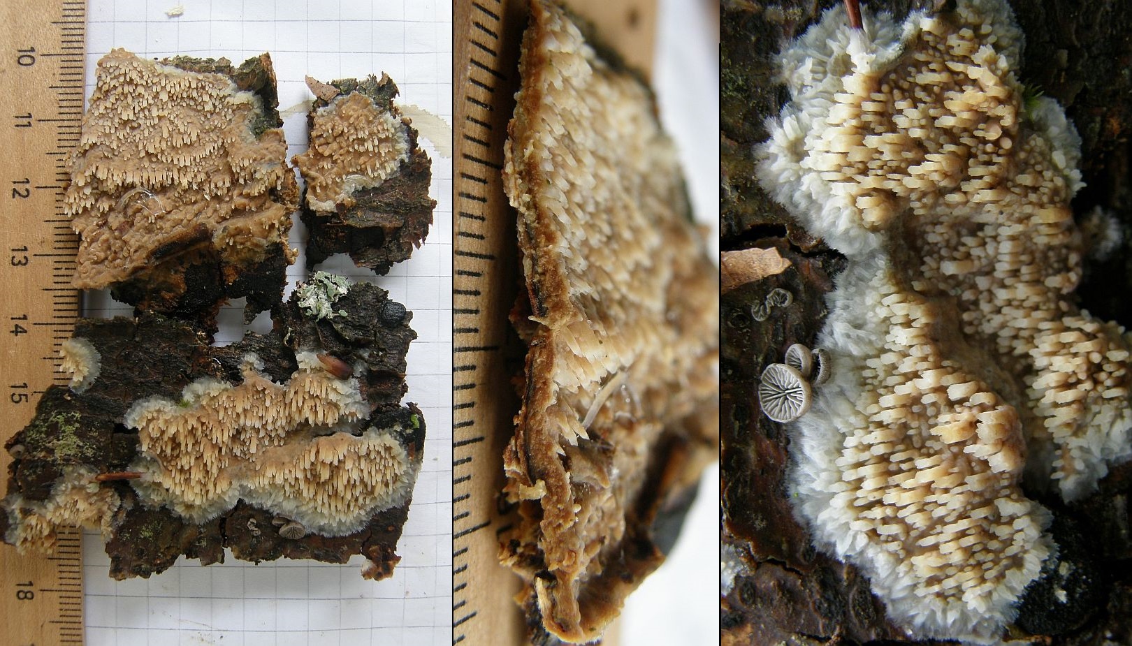 die Pilze beginnen mit der Fruchtkörperbildung meistens an abgestorbenen, aber noch ansitzendem Substrat im Luftraum, wachsen aber auch an abgefallenem Substrat noch weiter, dann sehen die Zähnchen und Stacheln bisweilen merkwürdig verbogen aus, wenn der Pilz sie nach dem Abfallen des Astes wieder versucht, geotrop auszurichten;