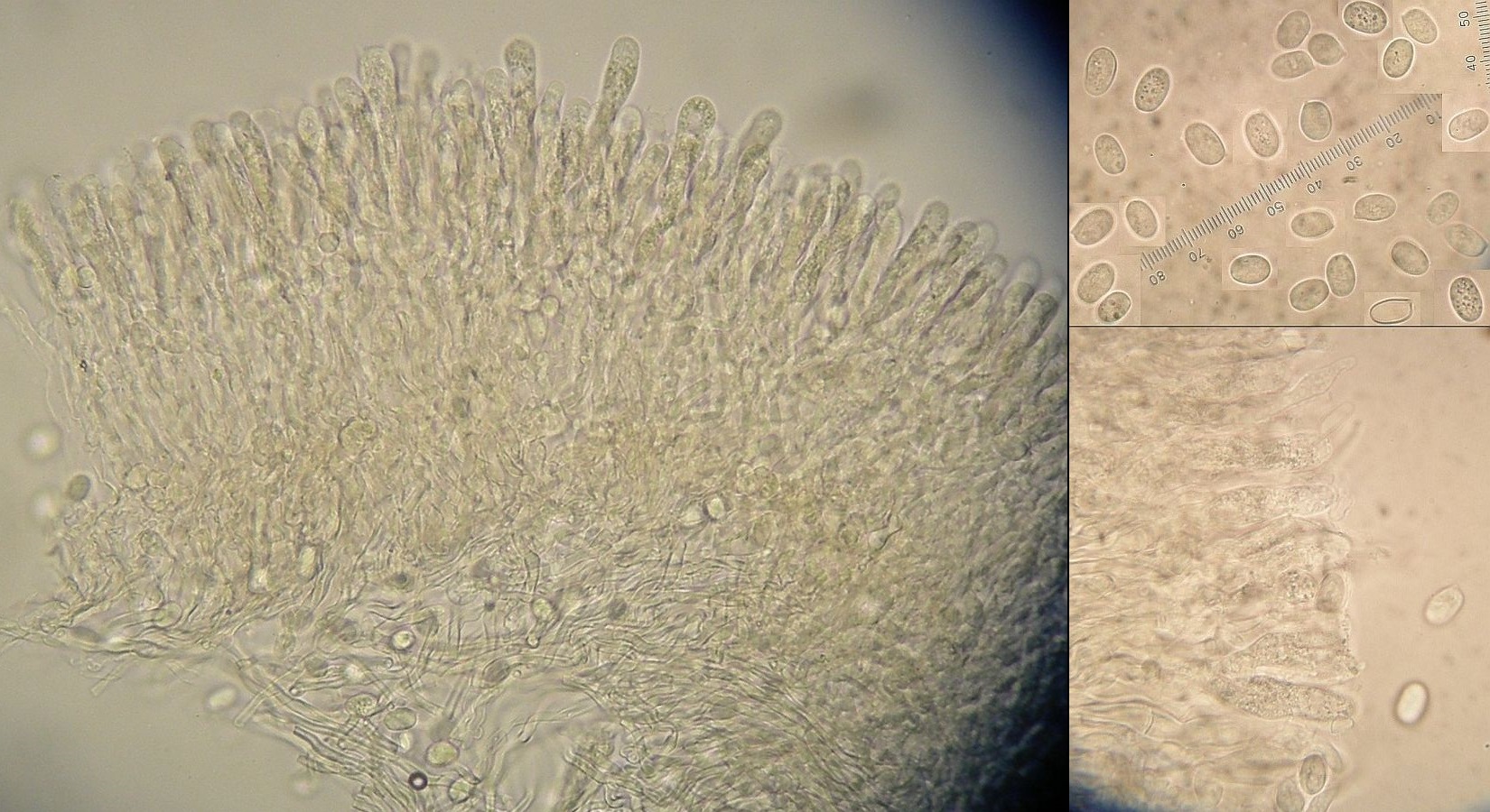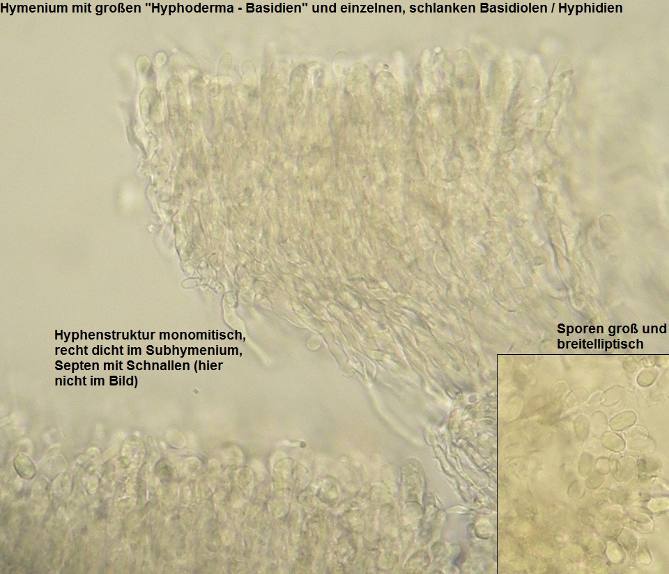 Maßgeblich sind neben der Form der Fruchtkörper also das monomitische Hyphensystem, Septen mit Schnallen& Hyphen hyalin (auch im subikulum nicht pigmentiert), die großen, irregulär keuligen und meist +/- gestielten Basidien, fehlende Zystiden und die ziemlich großen, breiten, elliptischen Sporen.