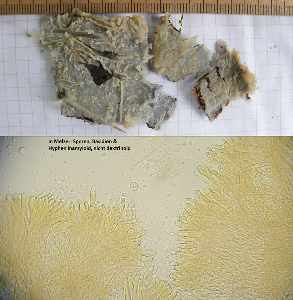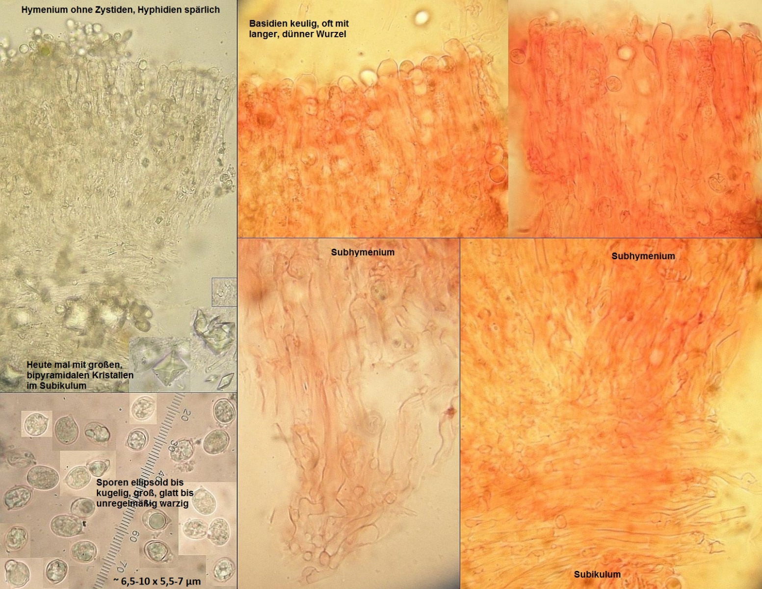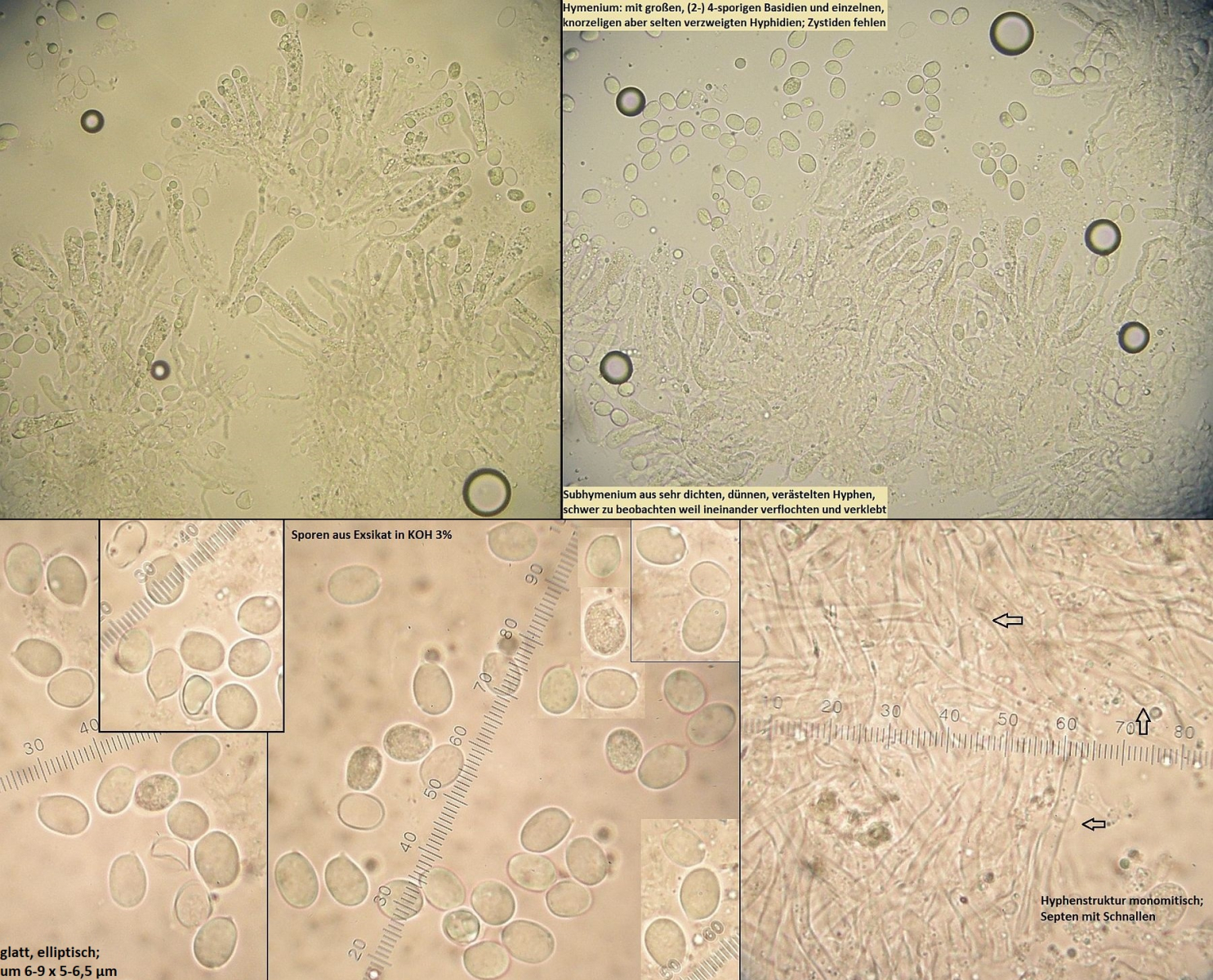 Hymenium mit relativ großen (bis 40x10 µm), unregelmäßig keuligen Basidien mit Inhalt aus diversen Tröpfchen; Zystiden fehlen; Hyphidien sind in den meisten Kollektionen ausgeprägt aber eher unauffällig, selten verzweigt;