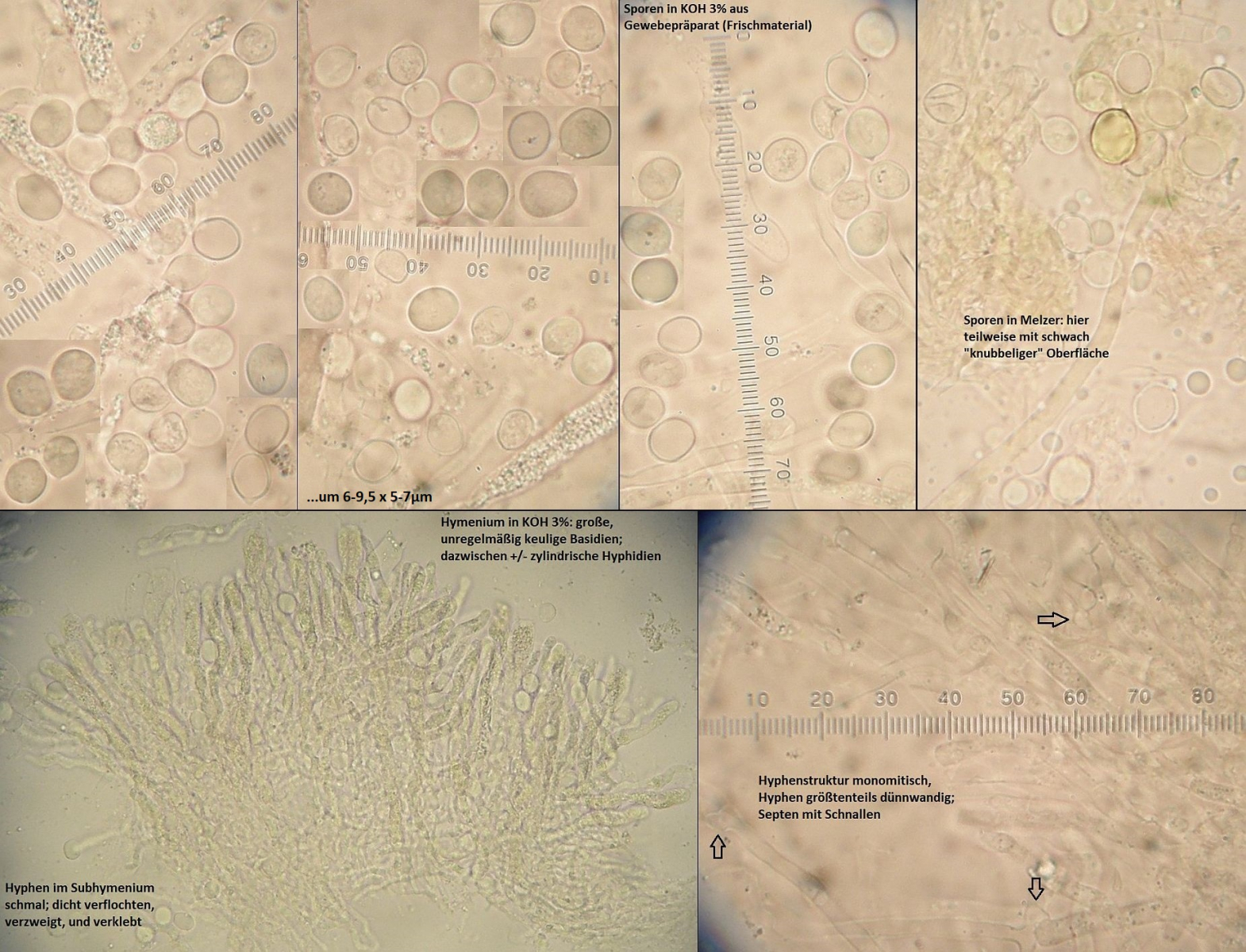 Sporen inamyloid, breit elliptisch bis subglobos (selten einzelne fast kugelig), mit deutlichem Apikulus, dünnwandig aber bisweilen undeutlich doppelwandig wirkend, wegen dem Inhalt aus (in Leitunsgwasser) vielen kleinen oder auch wenigen bis einem einzigen großen Tropfen, der die gesamte Spore ausfüllen kann; Sporenwand glatt bis etwas unregelmäßig knubbelig, manchmal auch mit einzelnen, fein warzigen Sporen; Sporen normalerweise um 6-9(10) x 5-7(8) µm; Q meist um 1,1 - 1,5